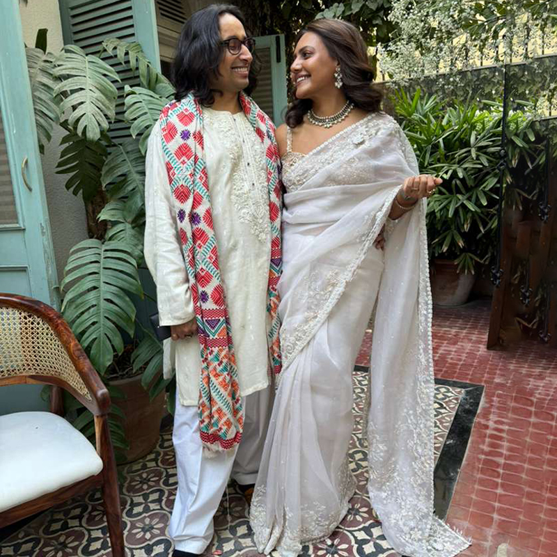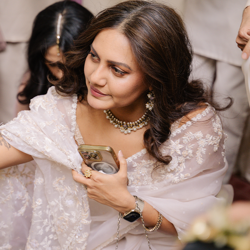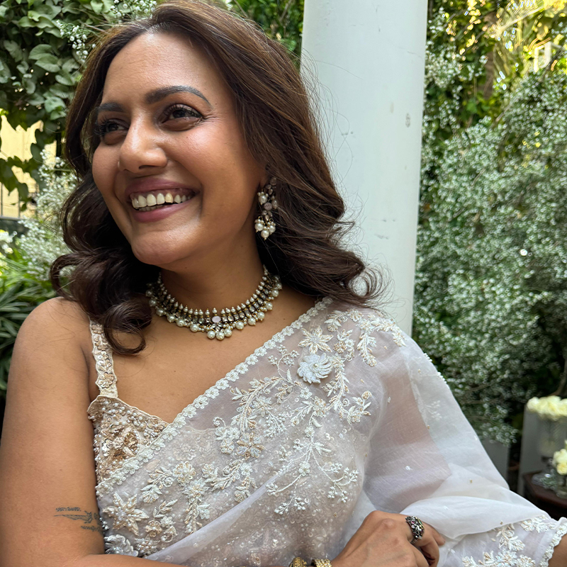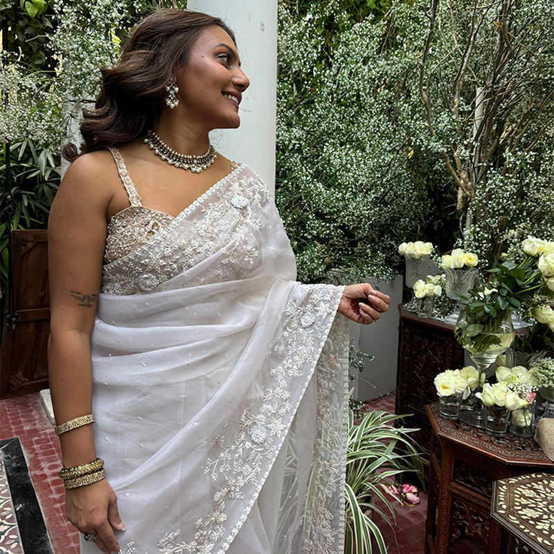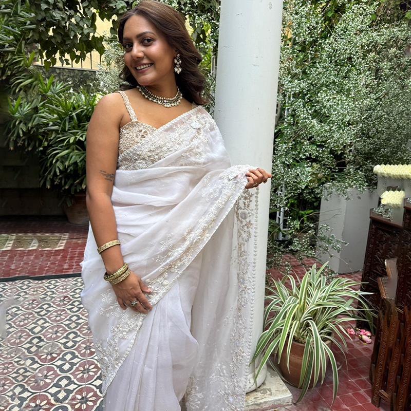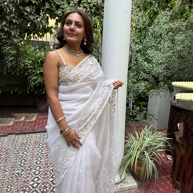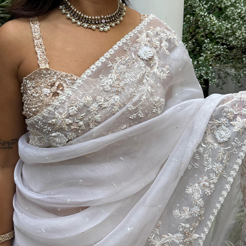 A sheer ivory organza sari scattered with luminous appliqué florals, each bloom delicately embroidered to shimmer with movement. Paired with a biscuit-toned fully hand embroidered georgette blouse, the ensemble is delicate, luminous and quietly captivating.