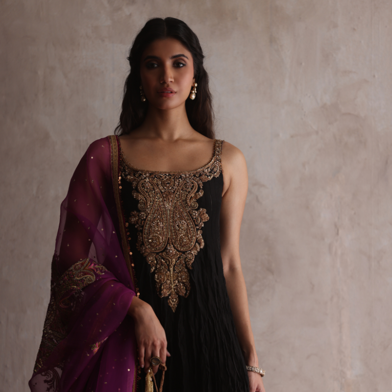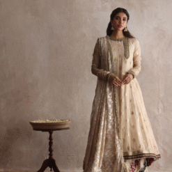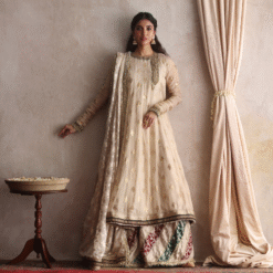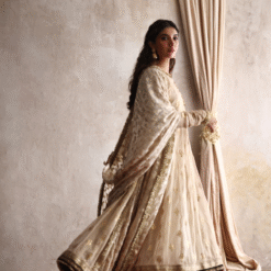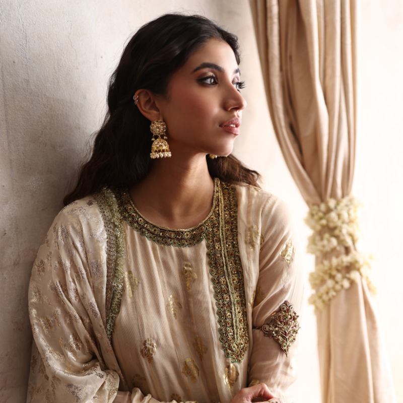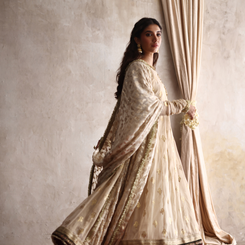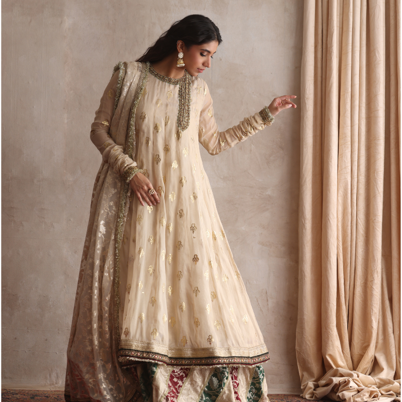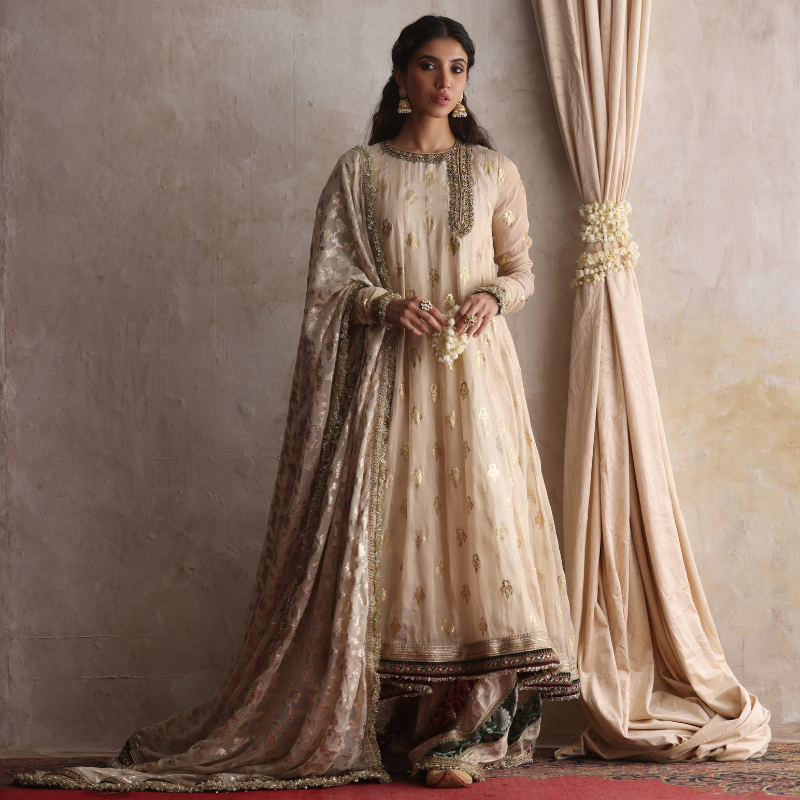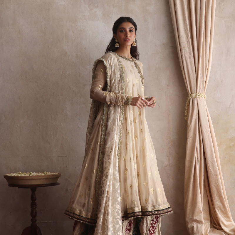 A three-piece ensemble in luminous off-white mesuri chiffon, shimmering with a soft golden sheen. The kalidar kameez has custom block print design, elegant churidar sleeves and it is adorned with exquisite zardozi hand embroidery along the neckline, sleeves, and back motif. It is paired with a chatapati kalidar pajama and a gorgeous badla chiffon dupatta, delicately complementing the ensemble’s ethereal charm.