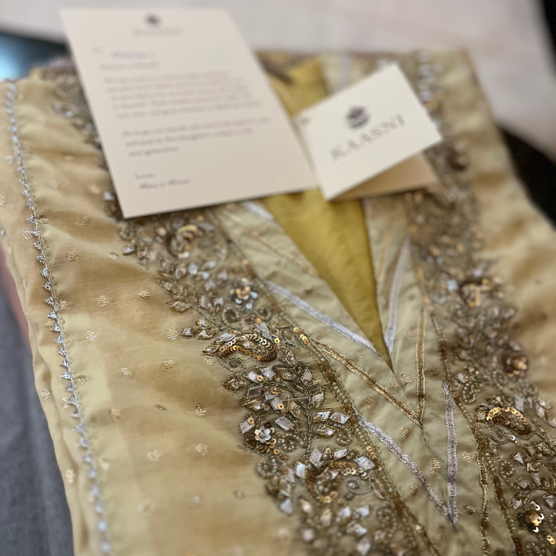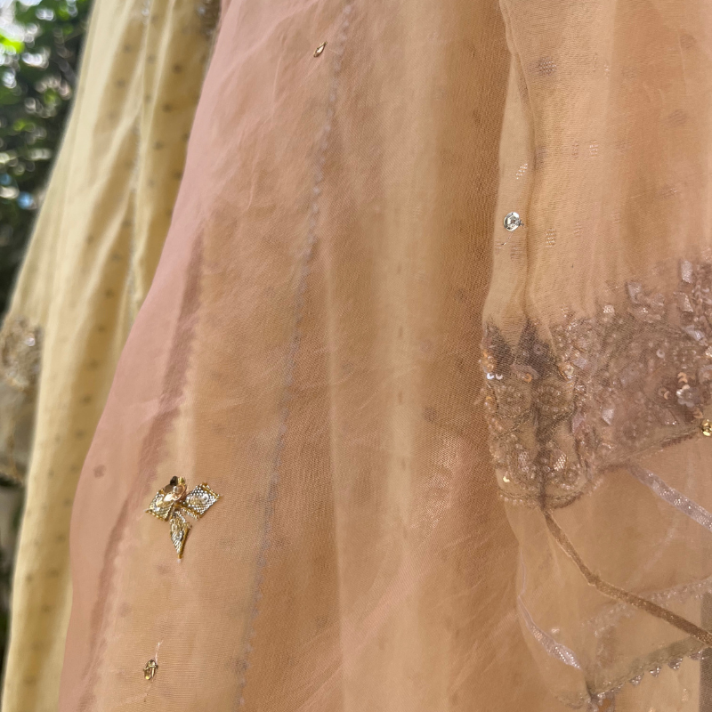 A butter-yellow chanderi cotton kurta with cotton pants, complemented by a salmon-pink organza dupatta. The neckline, sleeves, and back motif are detailed with aari embroidery using gotta patti, resham, sequins and beads. The dupatta carries scattered sequins and small gotta patti motifs, finished with organza edging and champa-sikhia trims.