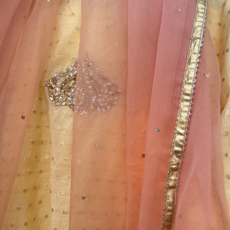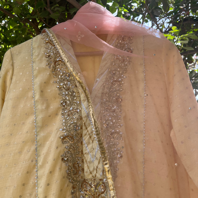 Butter yellow ebroidered kurta and pants with salmon pink organza dupatta. 3 piece.