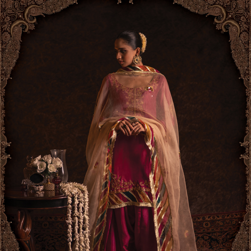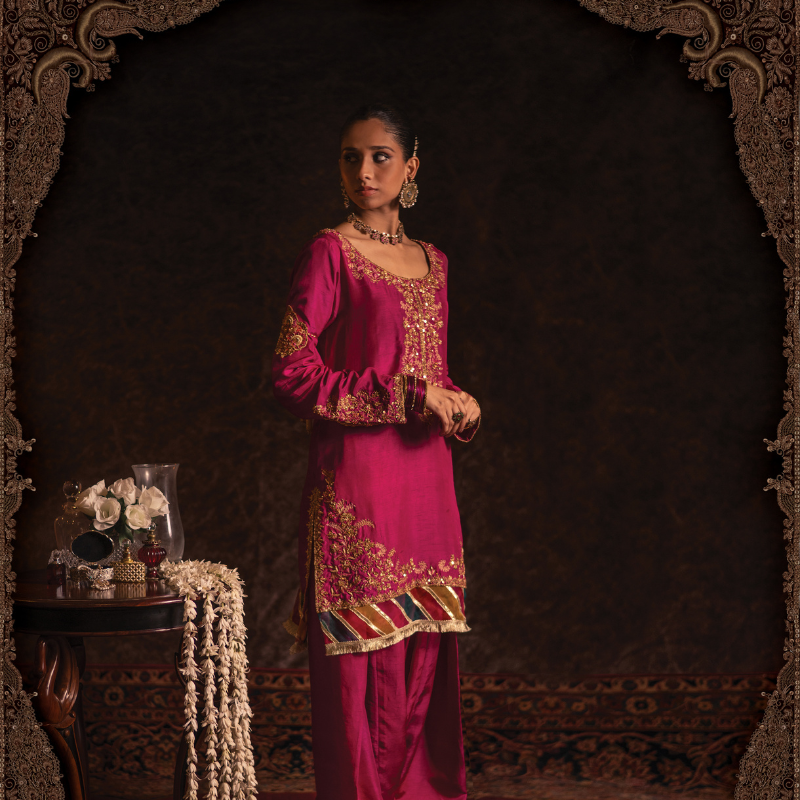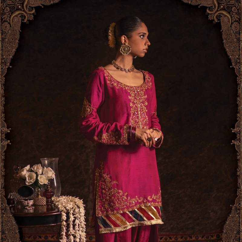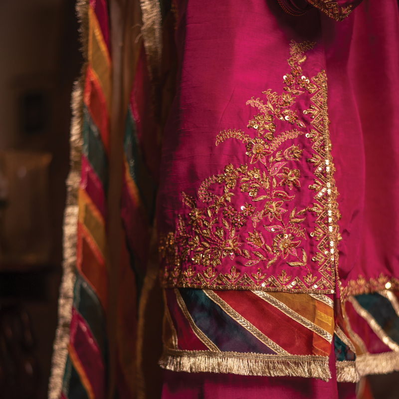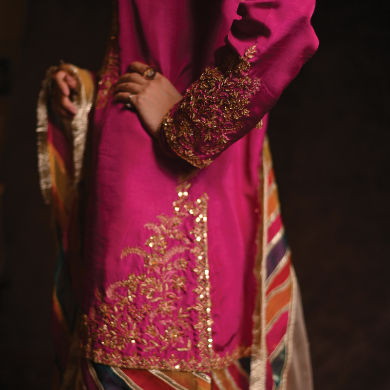 In vibrant hot pink silk, the Gulaal kameez shalwar showcases fine aari embroidery in resham and sequins along the neckline, sleeves and hem, complemented by traditional organza chatapati detailing and gold kiran edging. The Ivory-pearl coloured organza dupatta echoes the theme with hand-embroidered motifs throughout and a matching chatapati + kiran finish.