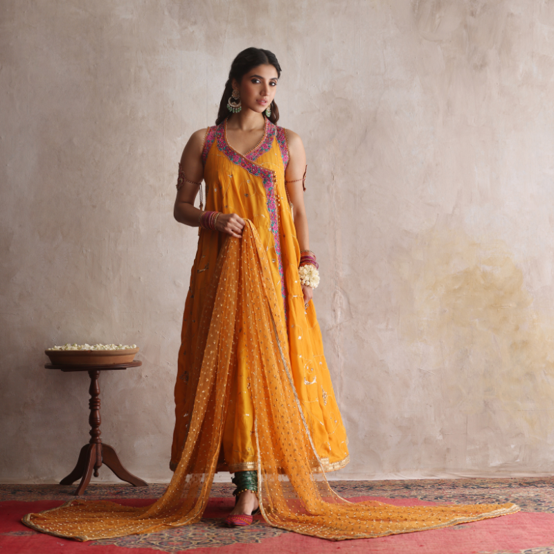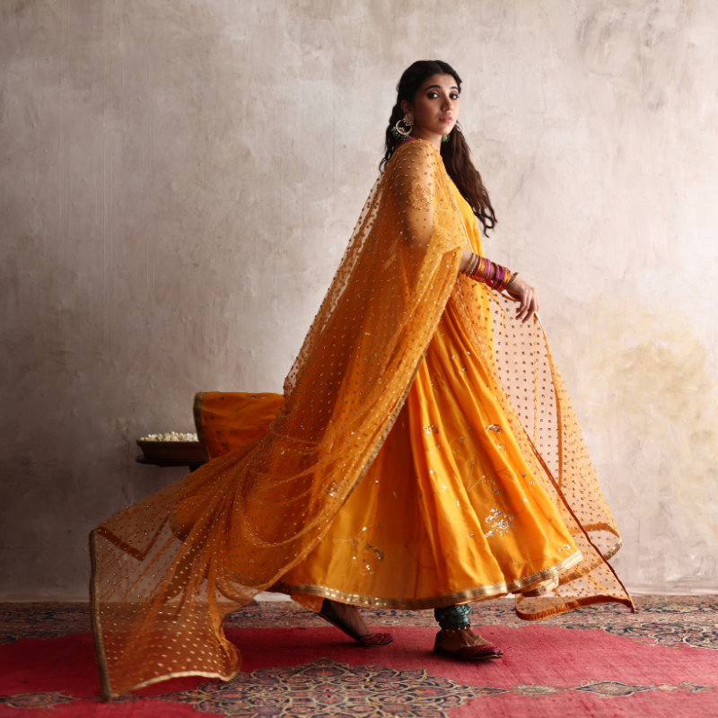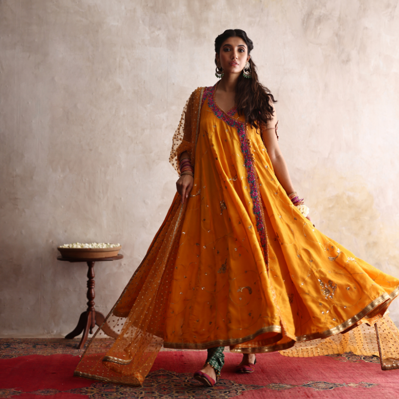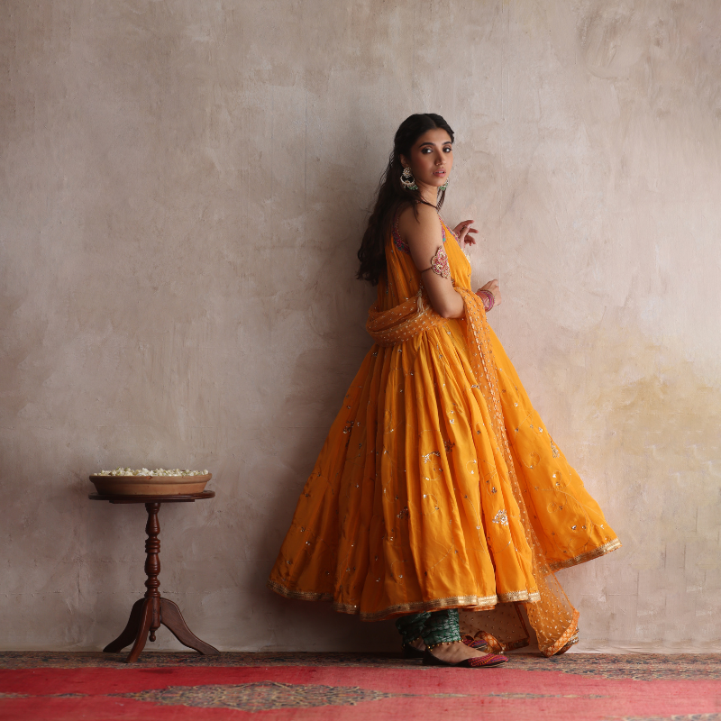 A saffron kalidar traditional angarkha crafted in luxurious silk, featuring a voluminous 6-8 yard gher adorned with intricate aari and zardozi hand embroidery throughout, highlighted with delicate pink appliquè accents. The back neckline showcases a net accent adorned with a beautiful rose zardozi motif, adding an elegant touch of sophistication. Paired elegantly with rich green jamawar churidars, edged with ghungroos, and a saffron georgette chiffon dupatta, fully hand-embroidered in shimmering sequin work.