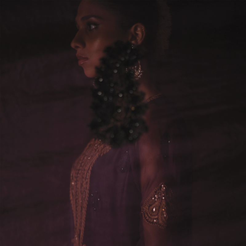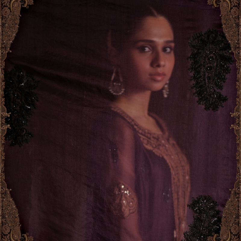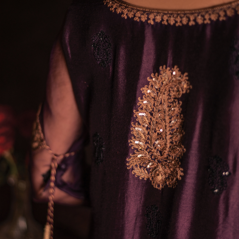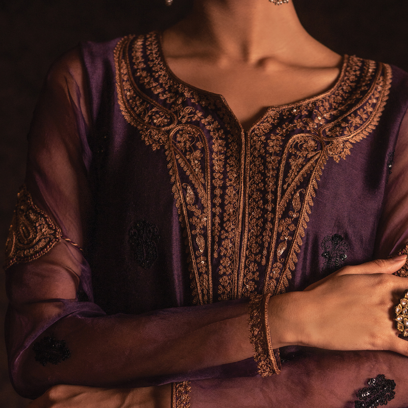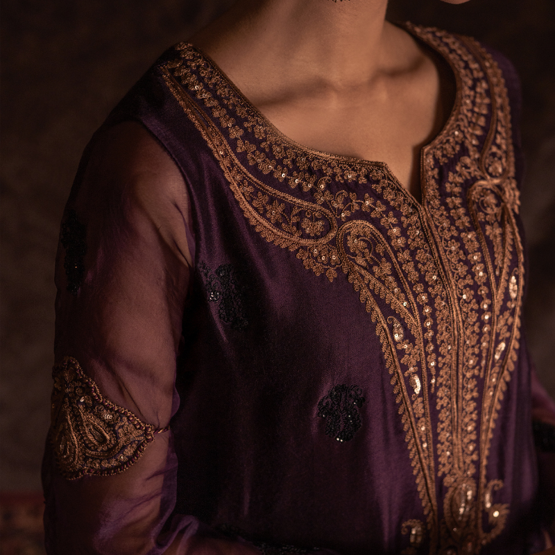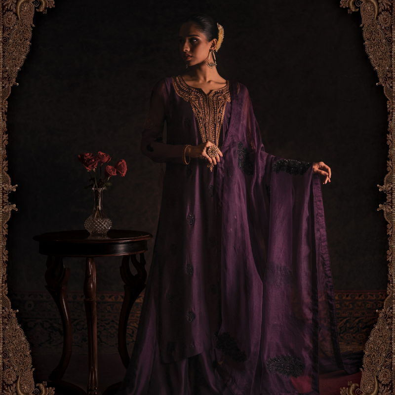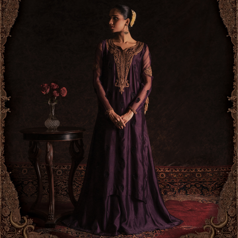 An elegant aubergine coloured silk silhouette elevated with sheer organza sleeves, detailed with resham and sequins aari work in gold across the neckline, a statement back motif, and scattered hand-embroidered motifs all over in black. Appliquéd bazubands finish the sleeve with quiet drama. Paired with a fluid silk sharara and an organza dupatta dusted with hand-worked motifs.