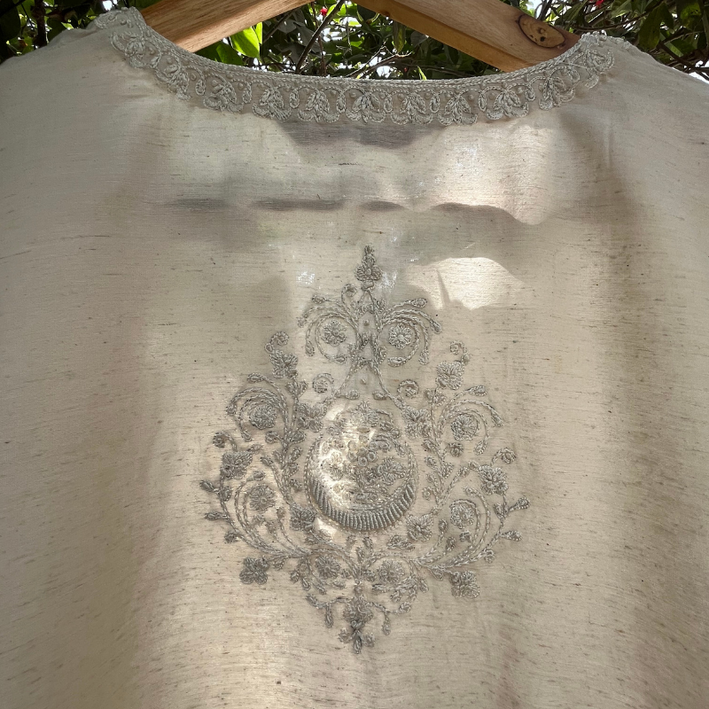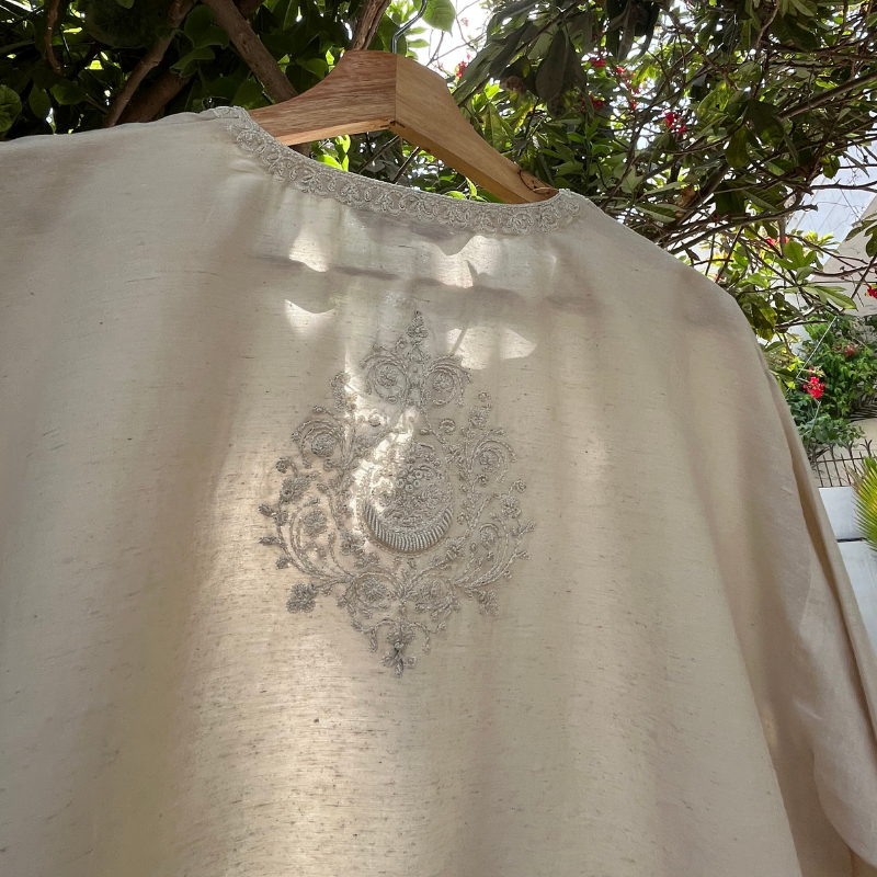 In natural karandi fabric color, this kurti features a classic gol-gala neckline with a v-slit, hand-embroidered in the same hues with resham aari work. Soft, easy, and quietly charming.