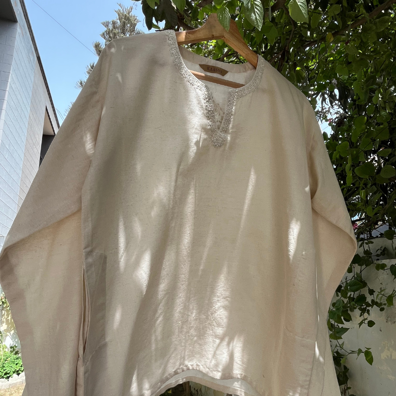 Cream hand embroidered men's kurti in Karandi with gol gala and v- slit.