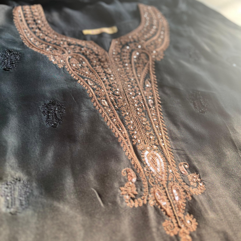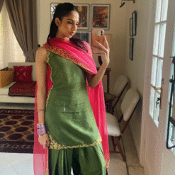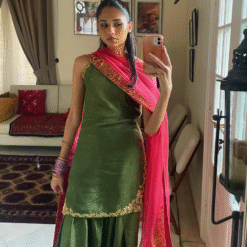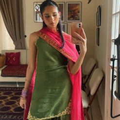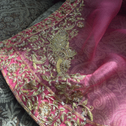 An army green raw silk kameez paired with a Farshi shalwar, detailed in classic zardozi that feels grounded yet contemporary. The salmon pink organza dupatta carries zardozi and aari embroidery in resham, tilla, and gold sequins, with finely rendered bird motifs that add a subtle charm.