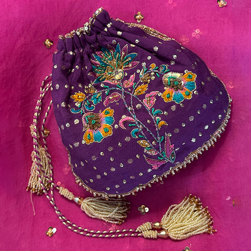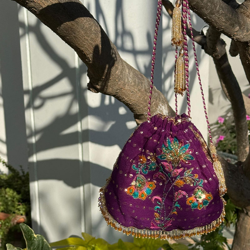 A timeless keepsake! Our hand-crafted Rangreza batwa bag is intricately hand-embroidered by our kaarigars using traditional techniques. The piece is adorned with intricate beaded fringe details and finished with specially hand-crafted beaded tassels that add a touch of movement and elegance.