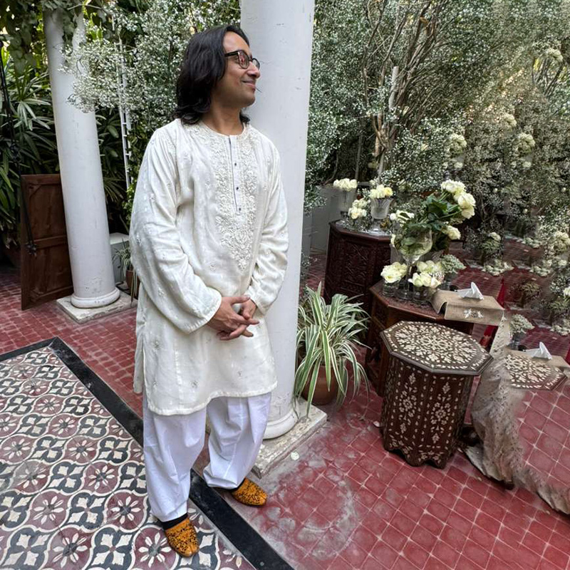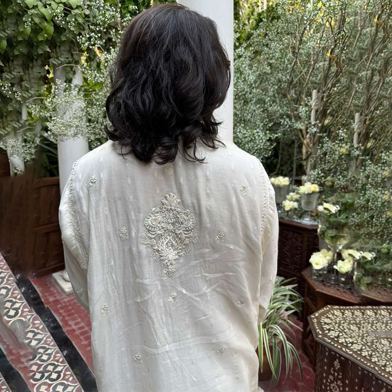 An ivory colored men’s kurta from our Nayab collection, woven in pure Indian Chanderi silk with self motifs. The piece is elevated with hand-done resham zardozi embroidery in ivory hues along the neckline, armhole, a back motif and small motifs all over, done in a chikankari embroidery manner. Finished with a traditional kurta patti and a classic round neckline for a timeless look.