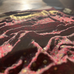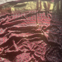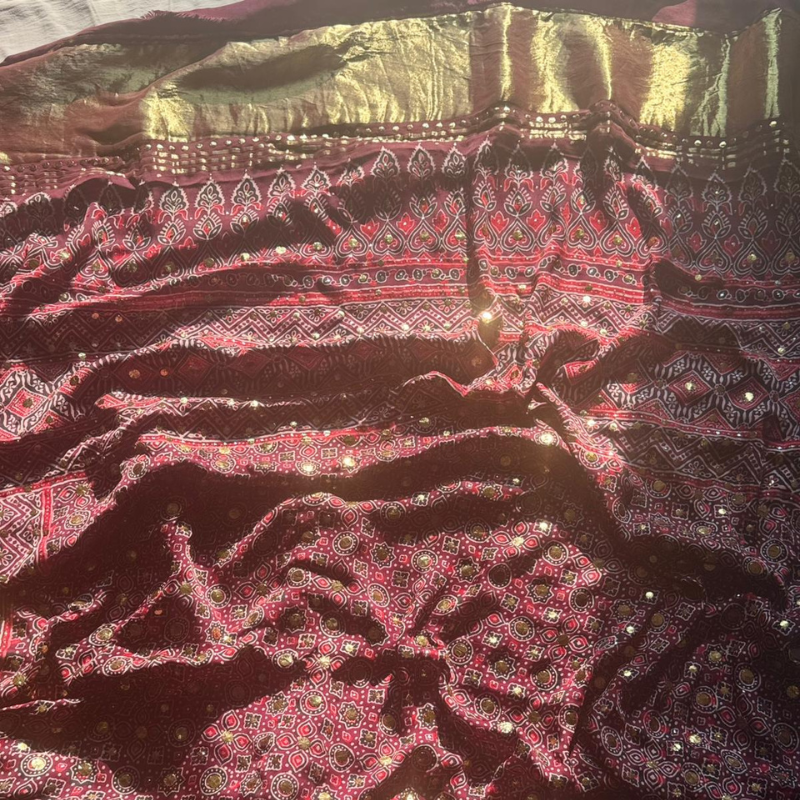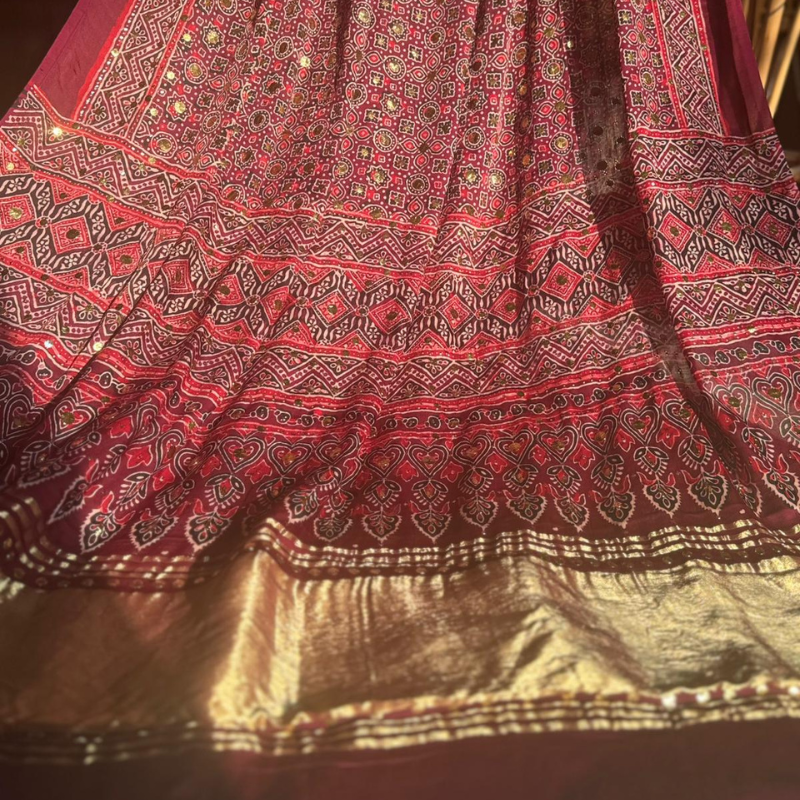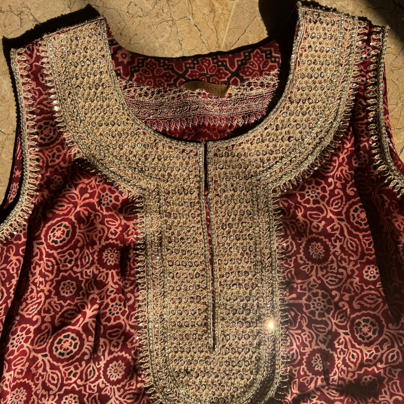 Sassi is a bespoke 2 piece ensemble that features the traditional vegetable-dyed Ajrak hand block print on a silk sleeveless kameez that is paired with matching block printed silk pants. The kameez has a finely embroidered neckline in resham anchor thread with bead work. Sassi is sophistication perfectly married with tradition.