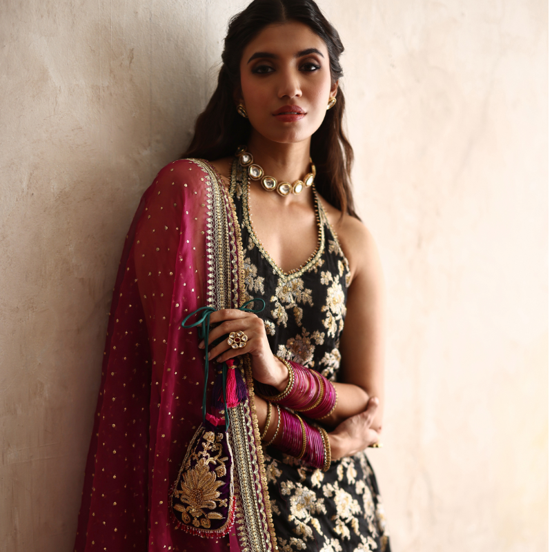A timeless keepsake! Our hand-crafted Siyaahi batwa bag is a cute little number made on velvet. It is intricately hand-embroidered by our kaarigars using traditional techniques. The piece is adorned with intricate beaded fringe details and finished with specially hand-crafted beaded tassels that add a touch of movement and elegance. Designed as the perfect complement to your formal and bridal ensembles, it carries the charm of old-world craftsmanship with a touch of contemporary elegance. Ideal for storing your essentials while adding a graceful accent to elevate your look.