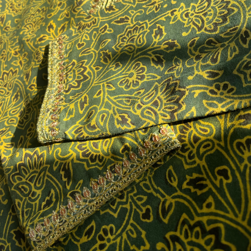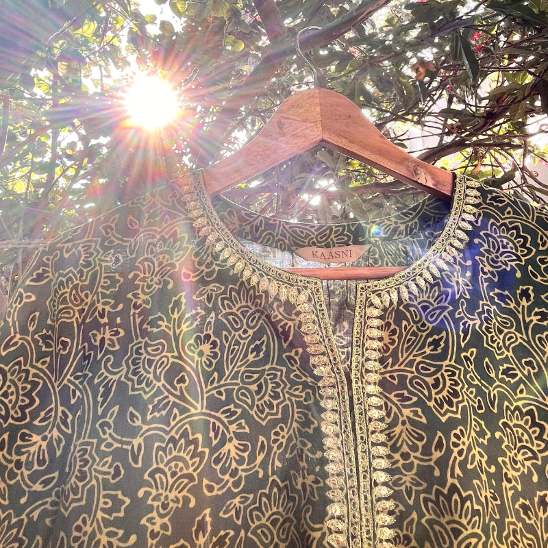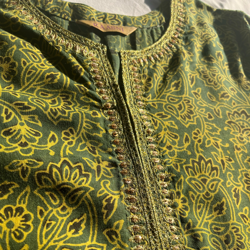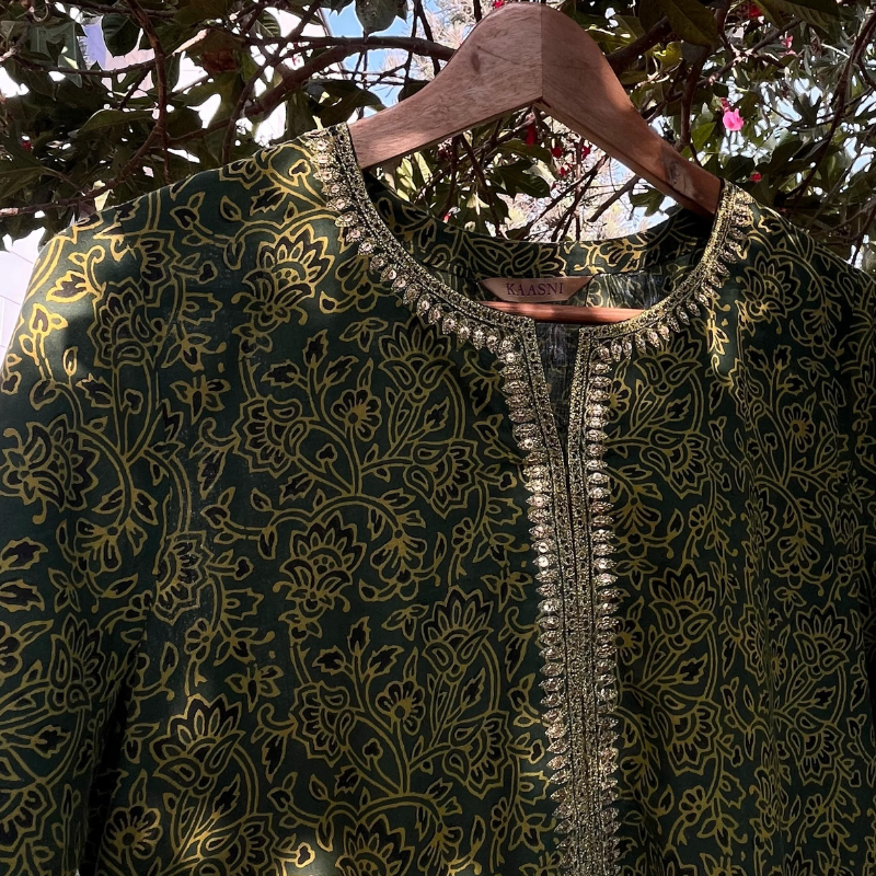 In naturally dyed green Ajrak with traditional block print, this kurta features a classic gol-gala neckline with a slit, hand-embroidered in gold tilla and subtle sequins aari work. Soft, easy, and quietly charming.