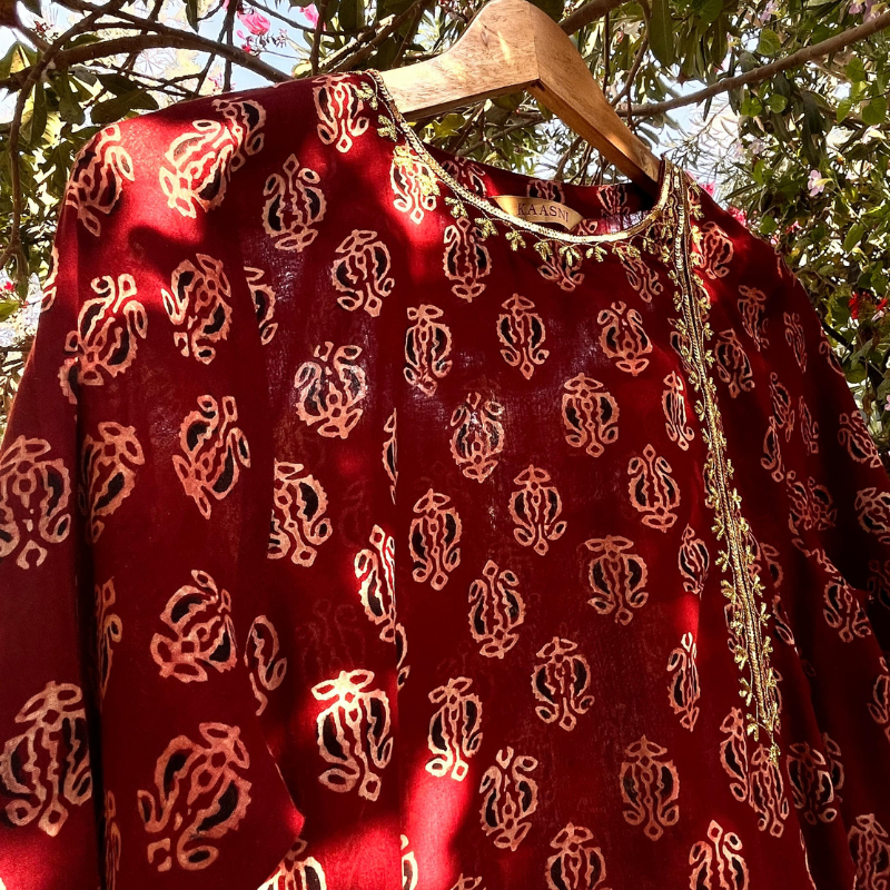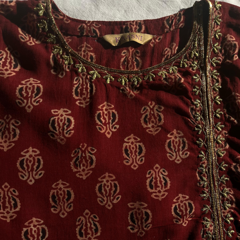 In naturally dyed red Ajrak with a traditional block print, this women’s kurta features a side-gala neckline, hand-embroidered in gold tilla and subtle sequins aari work. Soft, easy, and charming in its simplicity.