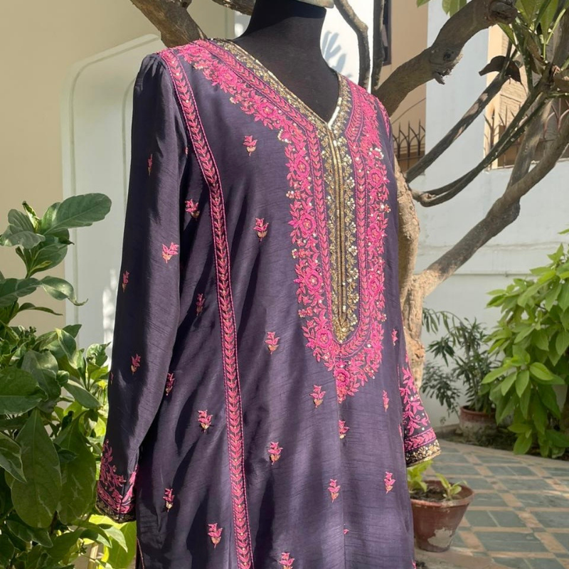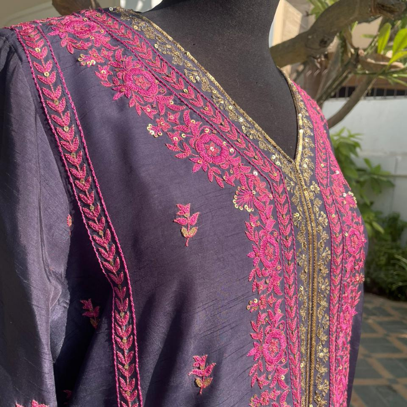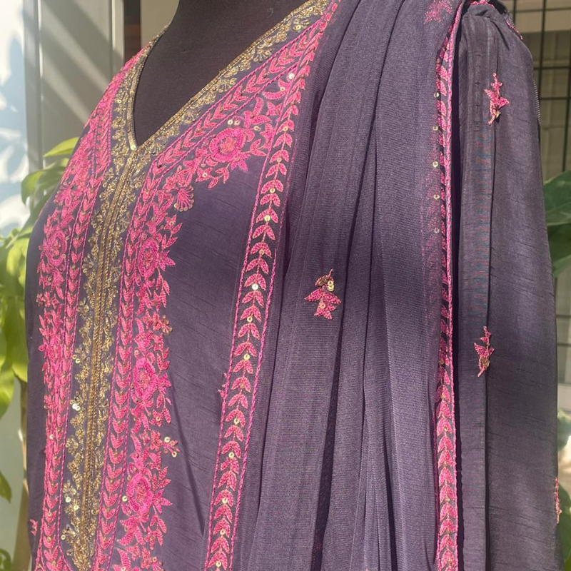 Zyva is a bespoke ensemble that features a navy raw silk kameez and palazzo pants and is finely hand embroidered in resham and tilla aari across the silhouette in shades of hot pink and gold. A sheer net dupatta, touched with subtle embroidered motifs and edging, ties the ensemble together with an airy grace.