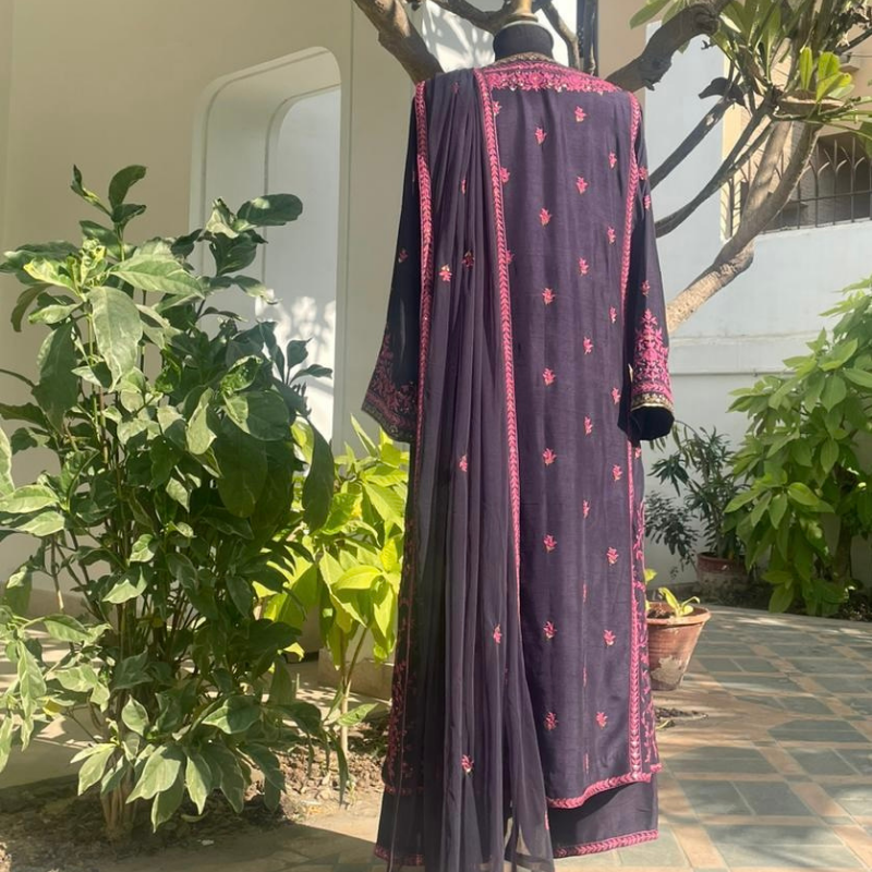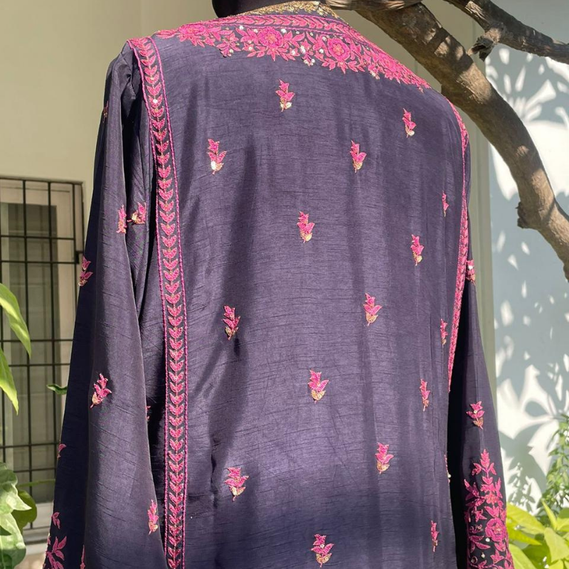 Midnight blue embroidered Korean rawsilk kameez and pants with net dupatta. 3 piece.